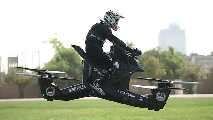 Bentuknya merupakan hasil persilangan antara sepeda motor dan drone. Kendaraan ini digunakan oleh polisi di Dubai untuk menjalankan tugasnya setiap hari. Pada saat mengendarai kendaraan tersebut, polisi mengendalikan kendaraan menggunakan stang dan kendaraan ini memiliki baling - baling seperti halnya drone. Sepeda ini memiliki kemampuan terbang hingga ketinggian 5 meter dengan kecepatan 100 km/jam. Kendaraan ini dapat dikendarai menggunakan awak maupun tanpa awak.